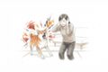 玄関で外出する人物と空の食器を見つめる子犬のイラスト。子犬の昼ごはんをあげられない状況のイメージ